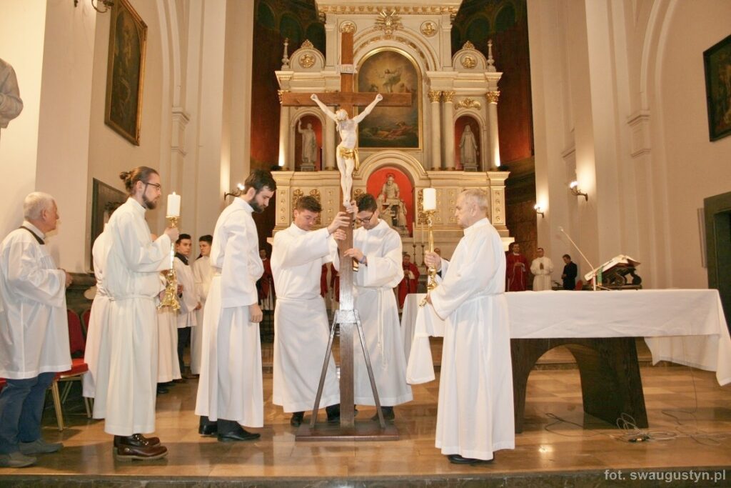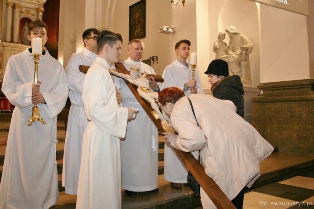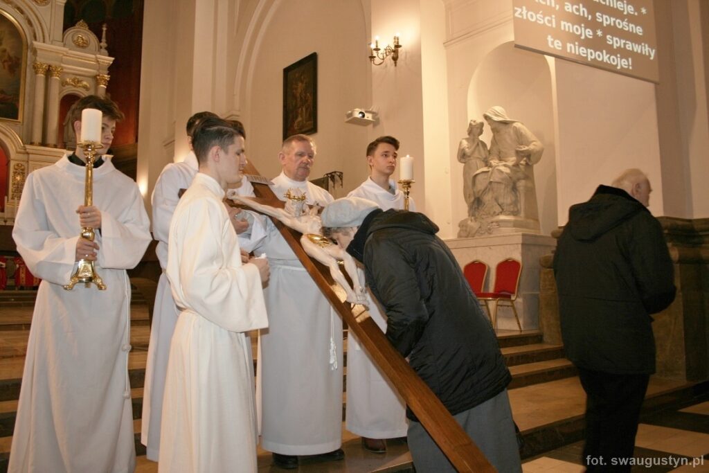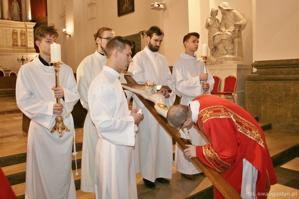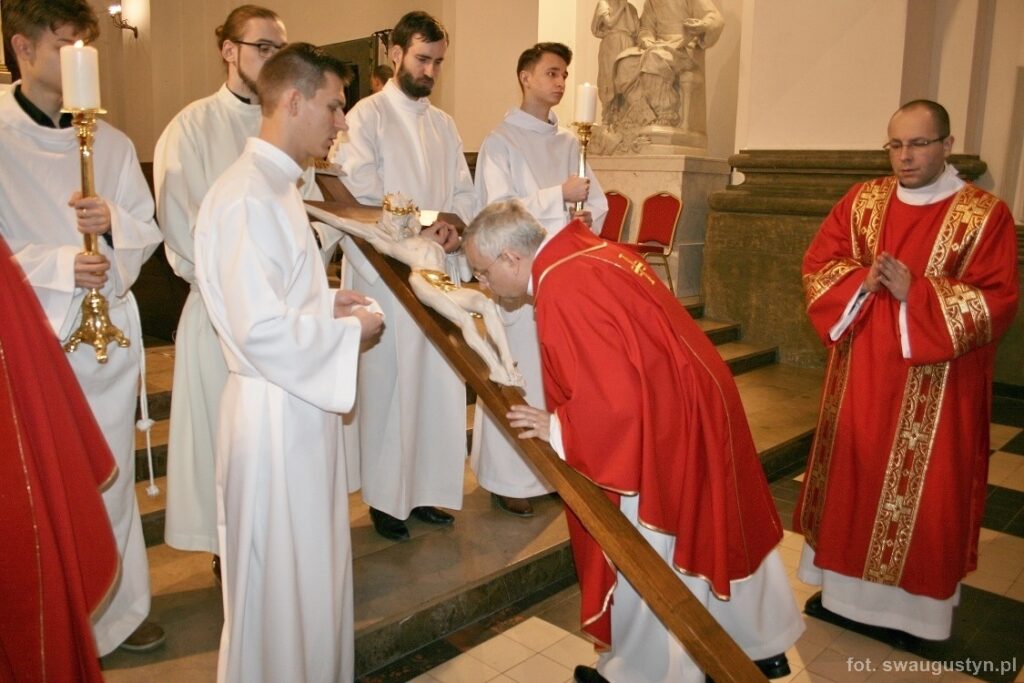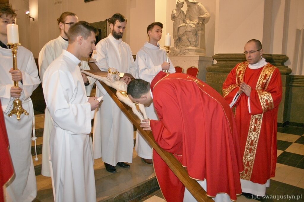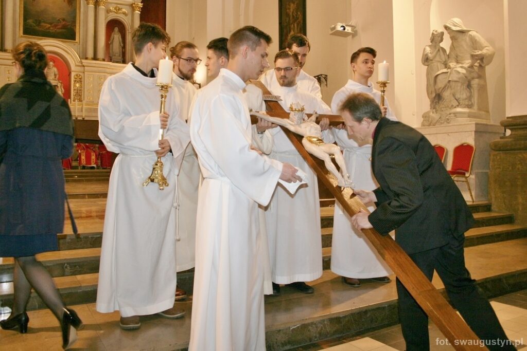 30.03.2018 r. obchodziliśmy Wielki Piątek. Tego dnia Kościół nie sprawował Eucharystii. Podczas wieczornej liturgii słuchaliśmy opisu Męki Pańskiej wg św. Jana. Po modlitwie wiernych Diakon uroczyście wniósł Krzyż zatrzymując się trzy razy i stopniowo go odsłaniając śpiewał wezwanie „Oto drzewo krzyża na którym zawisło Zbawienie świata”. Następnie wszyscy uczestniczyliśmy w Adoracji podchodząc do Krzyża i całując go. Po Komunii Świętej Pan Jezus w monstrancji okrytej białym welonem został przeniesiony do grobu, gdzie mogliśmy Go adorować do godziny 23.00.
