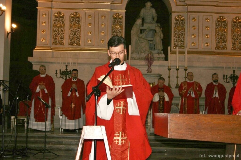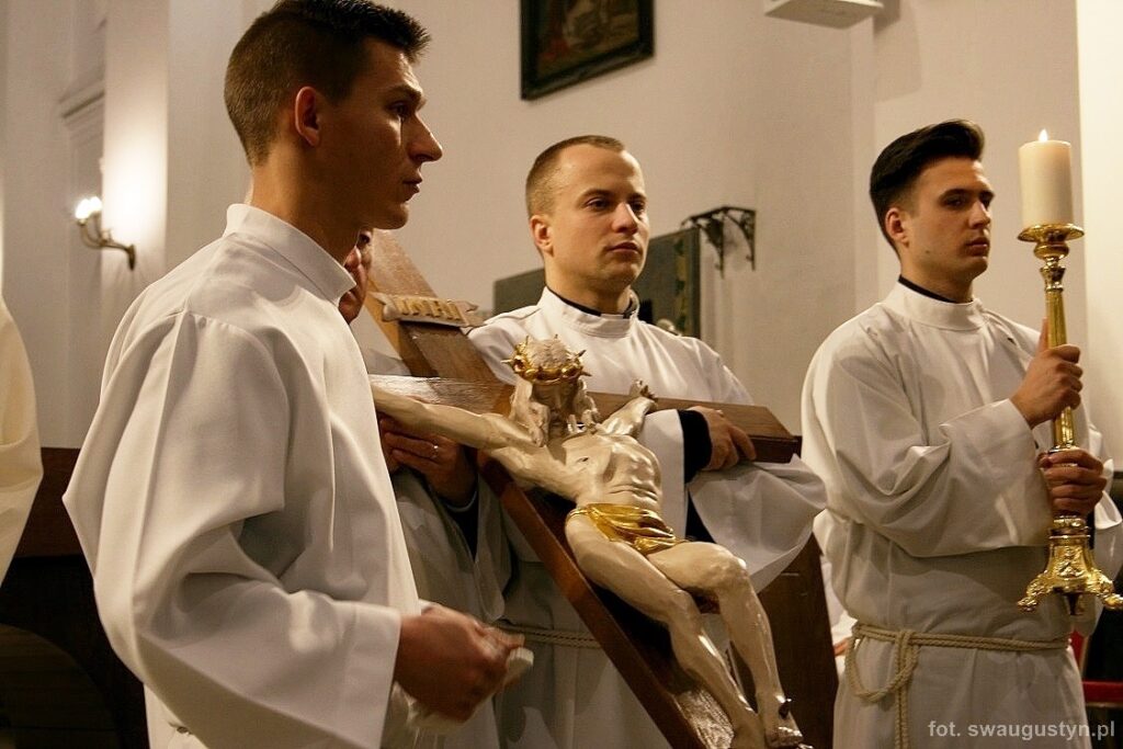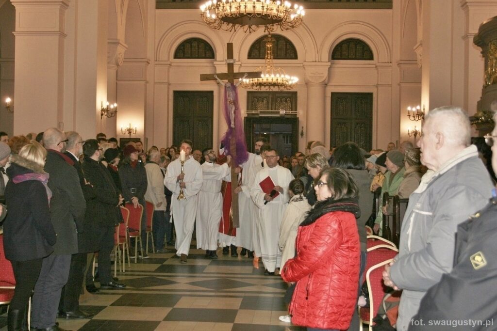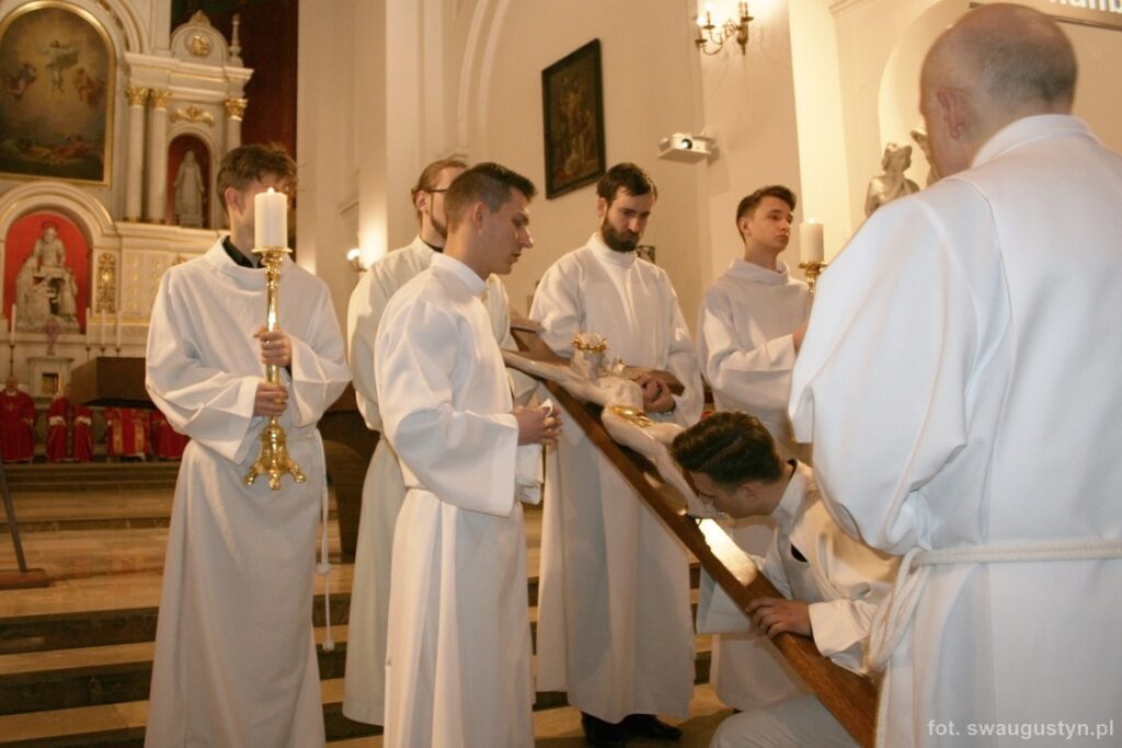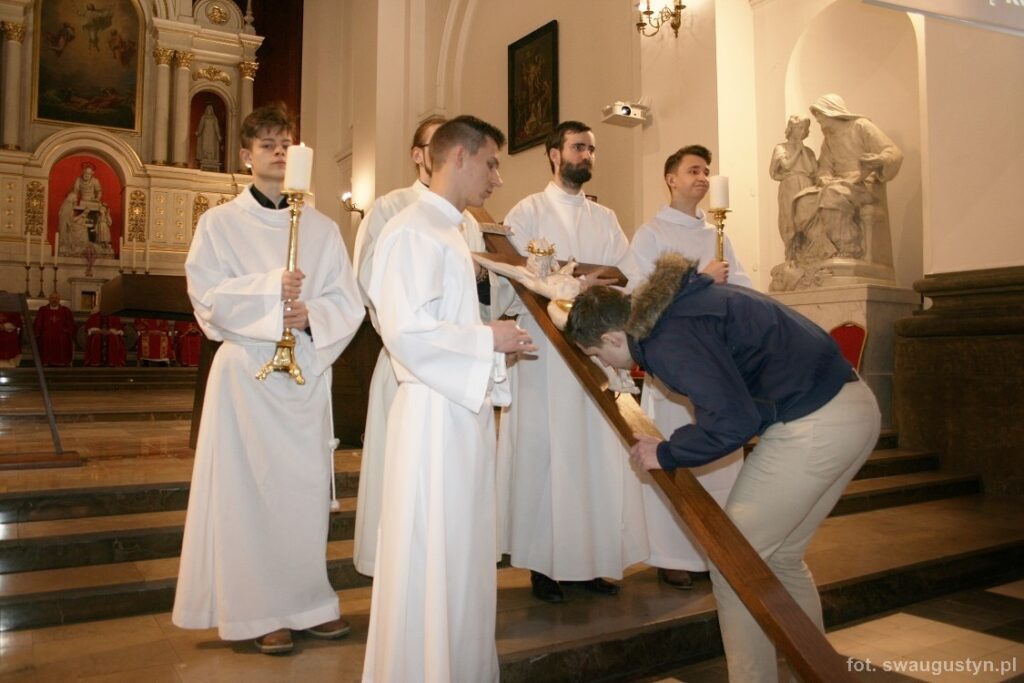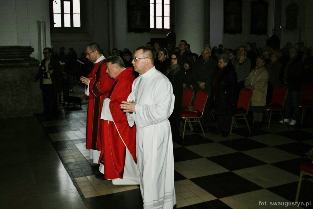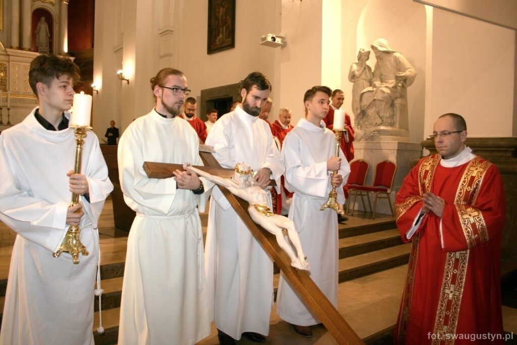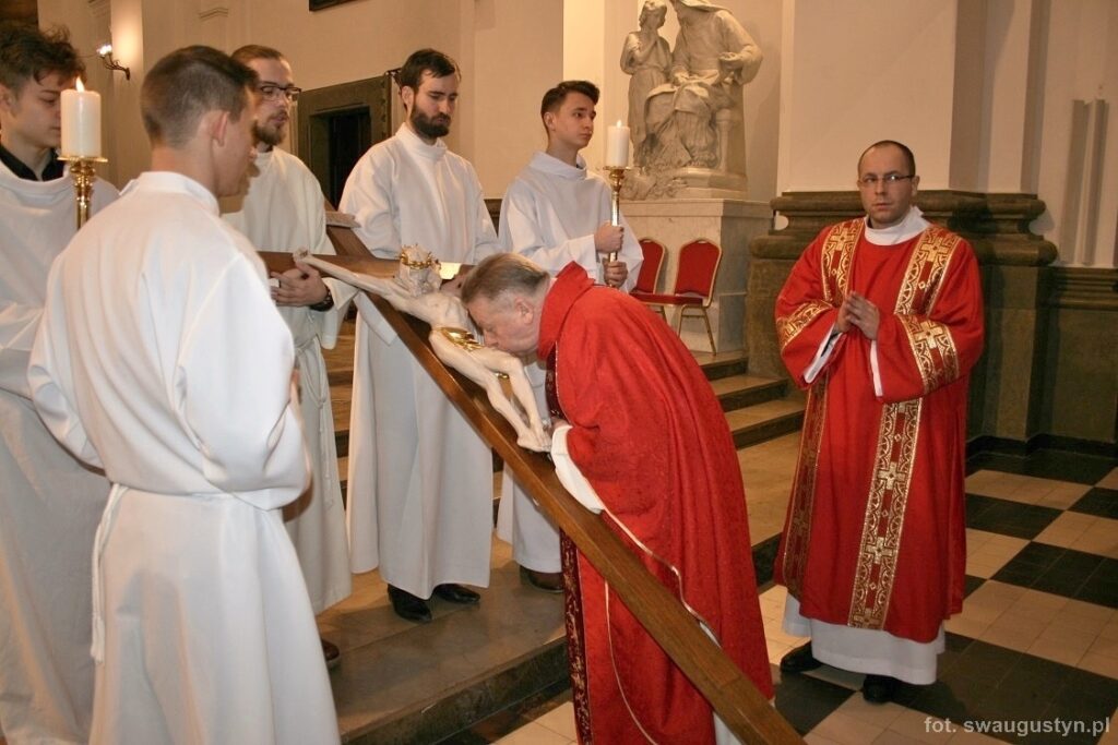 30.03.2018 r. obchodziliśmy Wielki Piątek. Tego dnia Kościół nie sprawował Eucharystii. Podczas wieczornej liturgii słuchaliśmy opisu Męki Pańskiej wg św. Jana. Po modlitwie wiernych Diakon uroczyście wniósł Krzyż zatrzymując się trzy razy i stopniowo go odsłaniając śpiewał wezwanie „Oto drzewo krzyża na którym zawisło Zbawienie świata”. Następnie wszyscy uczestniczyliśmy w Adoracji podchodząc do Krzyża i całując go. Po Komunii Świętej Pan Jezus w monstrancji okrytej białym welonem został przeniesiony do grobu, gdzie mogliśmy Go adorować do godziny 23.00.