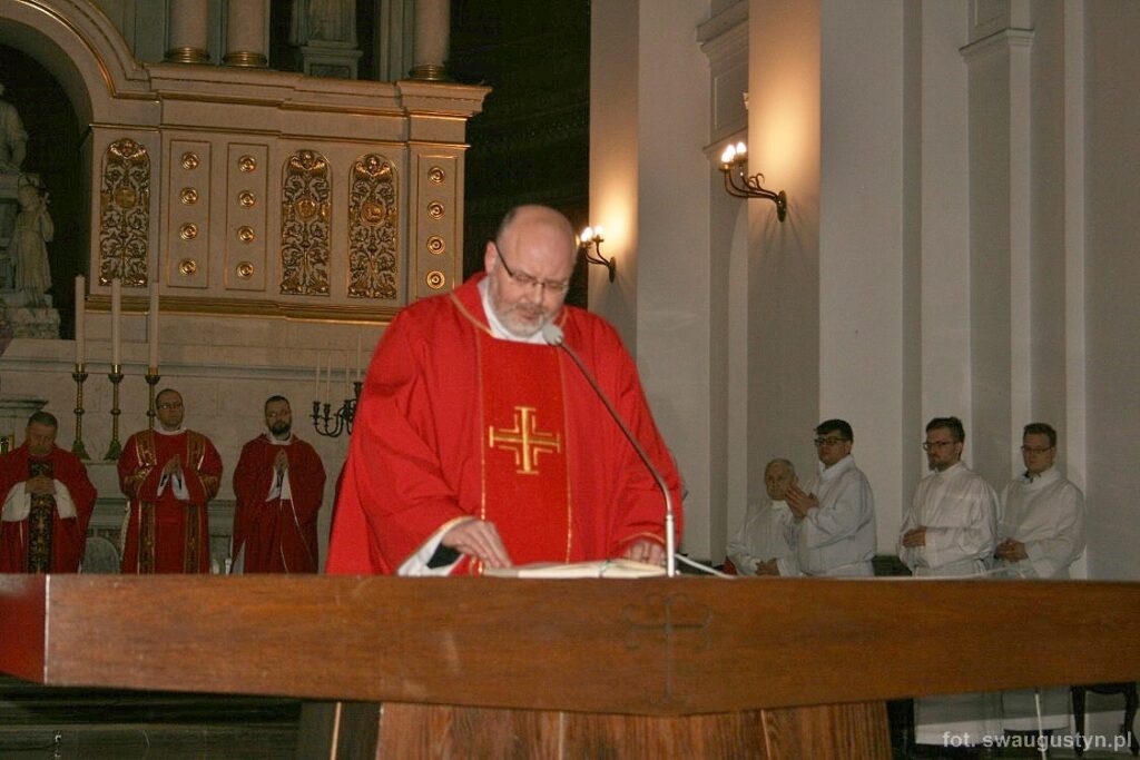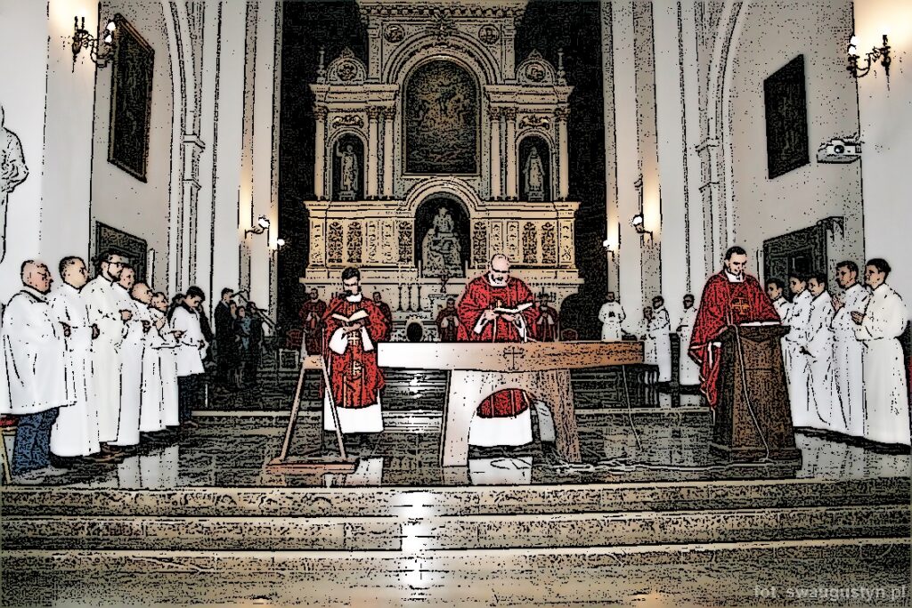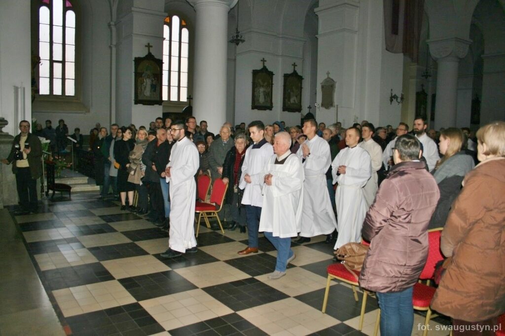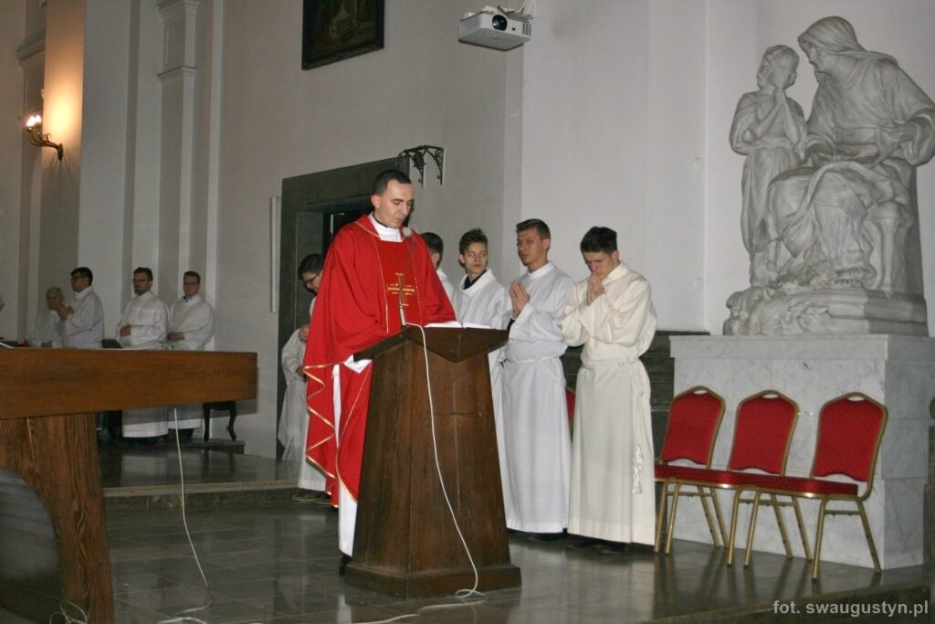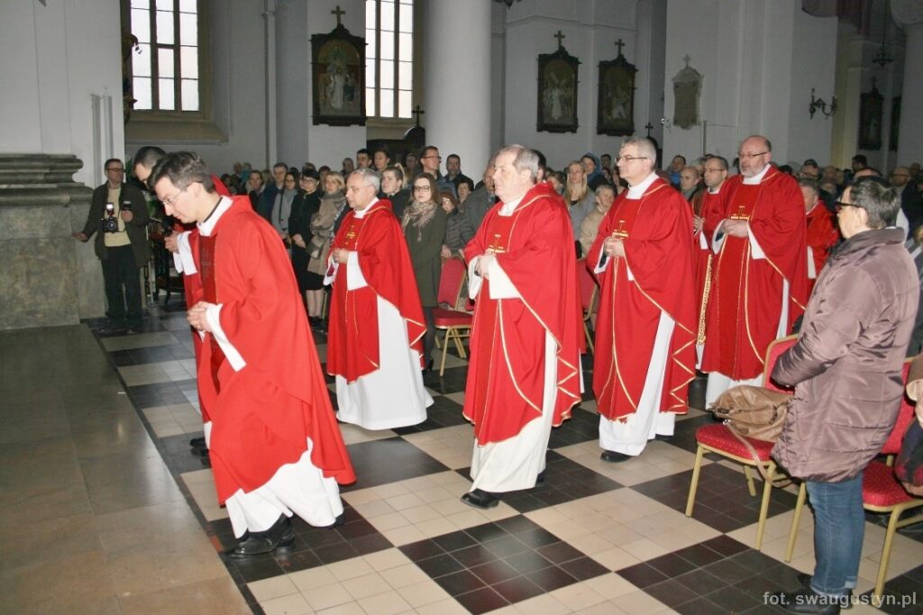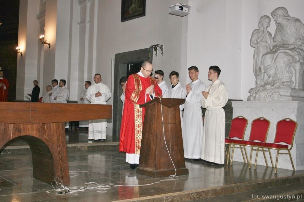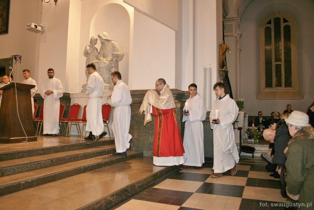 30.03.2018 r. obchodziliśmy Wielki Piątek. Tego dnia Kościół nie sprawował Eucharystii. Podczas wieczornej liturgii słuchaliśmy opisu Męki Pańskiej wg św. Jana. Po modlitwie wiernych Diakon uroczyście wniósł Krzyż zatrzymując się trzy razy i stopniowo go odsłaniając śpiewał wezwanie „Oto drzewo krzyża na którym zawisło Zbawienie świata”. Następnie wszyscy uczestniczyliśmy w Adoracji podchodząc do Krzyża i całując go. Po Komunii Świętej Pan Jezus w monstrancji okrytej białym welonem został przeniesiony do grobu, gdzie mogliśmy Go adorować do godziny 23.00.